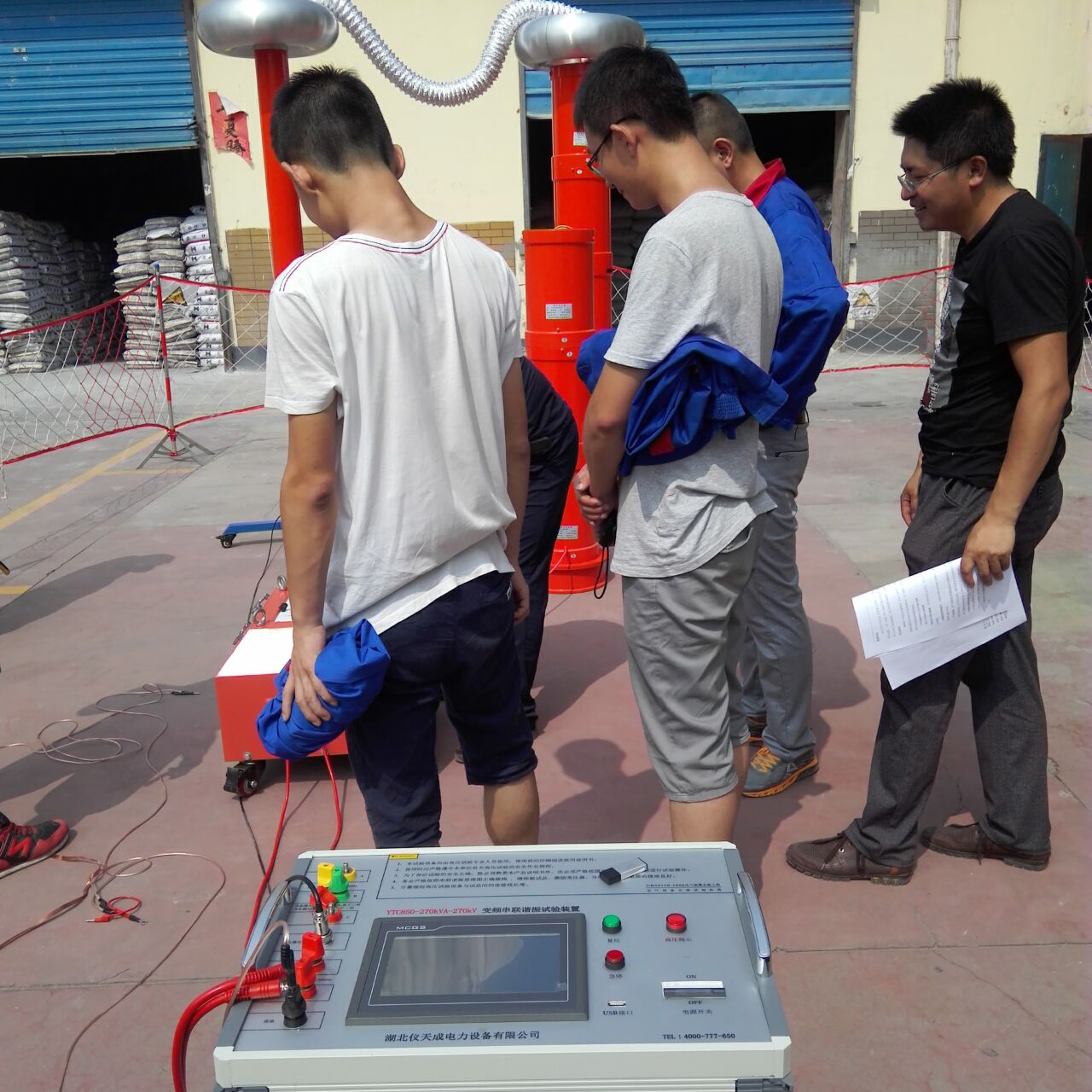 李工很快抵達現場,與客戶進行面對面的交流,了解客戶的需求和想法。然后開始講解設備,并認真講解怎樣安全操作設備。確??蛻裘靼琢税踩僮饕院?,李工帶領客戶一起做試驗——YTC850-270kVA/270kV變頻串聯諧振試驗裝置,YTCDG-1000A大電流發生器 這2套設備,其中這套變頻串聯諧振試驗裝置我公司的該設備為專利產品,諧振電源調頻及功率元件使用先進的日本進口的優質元器件,設計的是諧振式濾波電路,能改善輸出電壓的波形畸變,獲得很好的正弦波形,有效的防止了諧波峰值對試品的誤擊穿。變頻電源保護功能強,穩定性好;具備具備全自動(自動調諧、自動升壓)、全手動(手動調諧、手動升壓)以及半自動(自動調諧、手動升壓及手動調諧、自動升壓)的多種工作模式,可任意切換使用;操作方便。