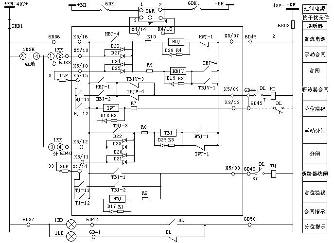 +KM → X5/16 → TBJ-1(TBJ-2)→ X5/08 → TQ線圈 → -KM,從而啟動斷路器跳閘線圈TQ,實現了手動跳閘。