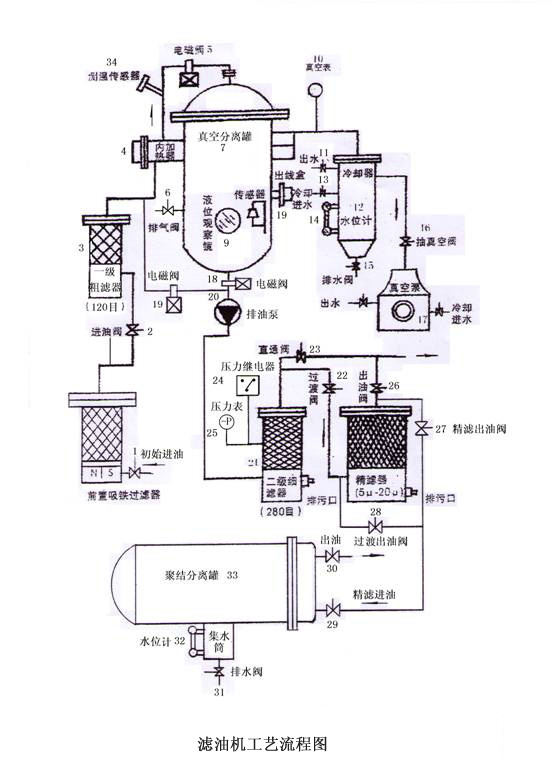 1、首先將所有閥門關閉,然后打開總電源,啟動真空泵(17),打開(16),當真空泵達到-0.09Mpa后,停(17),(5) ,(18), 電磁閥(19)自動打開,此時打開初始進油閥(1),進油閥(2)過閥(22)過濾出油閥,精濾進油閥(29)出油(30),這時才能啟動排油泵20)輸去油液進入聚結分離階段。