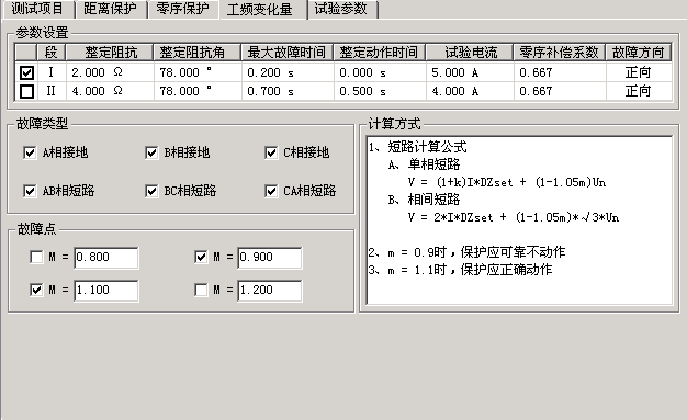 本模塊允許同時校驗兩段定值,并且一次性模擬所有故障類型。試驗時,只需要勾選需要測試的項目,然后按定值單將各種定值參數依次進行設置即可。M的值默認情況下有0.9和1.1兩種設置,一般地,M=0.9時,保護應可靠不動作,M=1.1時,保護應可靠動作。設置M=1.2時,可以測出保護的動作時間。“短路電流”參數應設置得大一些,建議10~20A,因為短路電流太小,根據上述公式計算出來的電壓可能為負值。試驗時,“距離保護”壓板應投入。
