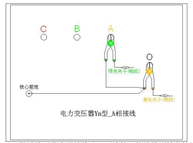 A相測量接線:1. 測量系統共一點接地,取變 壓器鐵芯接地。2. 黃夾子定義為輸入,鉗在 Yn 的‘O’點、綠夾子定義為測量,鉗在 A 相上。3. 地線連接網依次由綠夾子地線孔插入接地線至黃夾子地線孔,再連接一接地線到鐵芯接地。