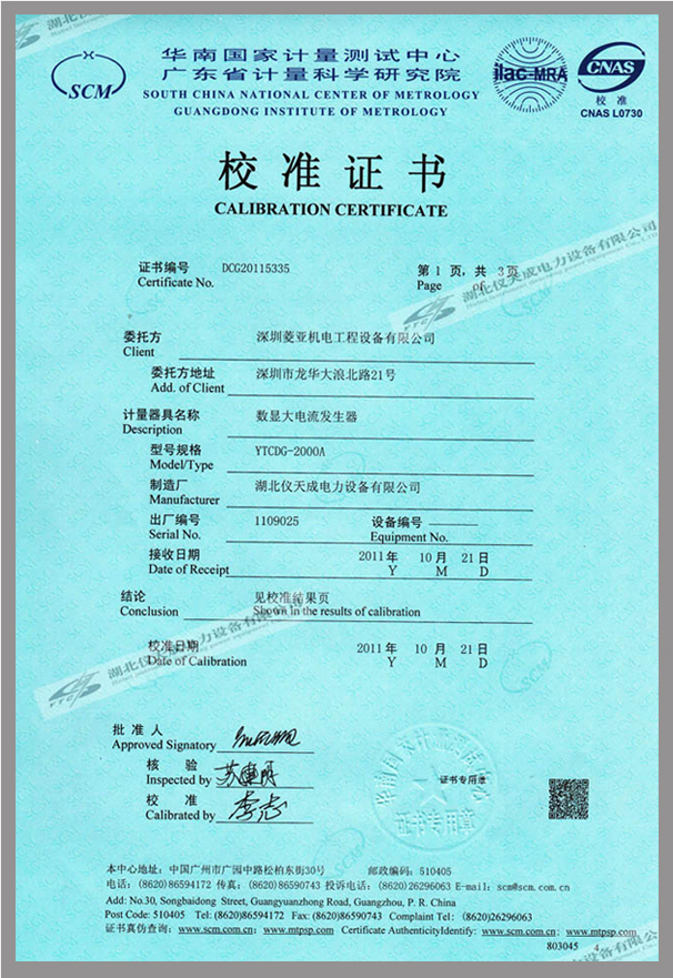 轉載:"YTCDG系列大電流發生器鑒定證書" 請注明來源于儀天成電力。 更多技術問題請致電儀天成電力客戶服務:027-87876585,技術部專線:027-87876585,在線客服:719388481